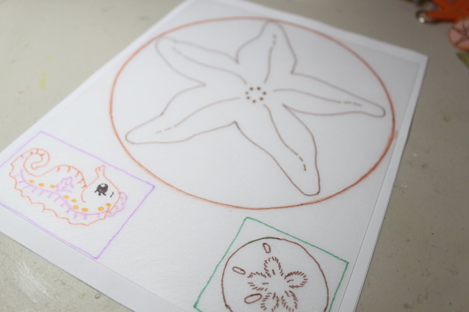 So I started thinking, "Let's invent our own starfish!" But I didn't want drawings of starfish that would end up at the bottom of a drawer so we'll make suncatchers to have out on display. When the sun comes through the shrinky-plastic, these suncatchers are so pretty. Unfortunately I was not able to capture how nice they are in real life so you'll have to trust me on this one.